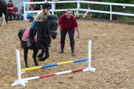 Dann wurde es wieder etwas rasanter. Unsere Springponys wurden gezeigt sowohl an der Hand als auch unter dem Sattel. Jonas mit Maximilian und Luisa-Marie mit Little zeigten das Springtalent der Ponys an der Hand und Sara auf Maja und Sonja auf Bounty unter dem Sattel.